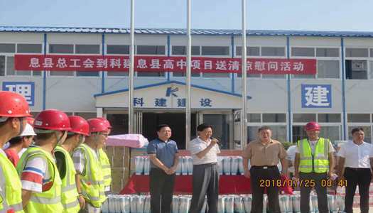 2018年07月25日8:30,息縣原副縣長吳昊、總工會(huì)主席戴清金,息縣城市建設(shè)投資有限公司息縣高中項(xiàng)目建設(shè)指揮部劉增書記等一行,頂著炎炎烈日前往息縣高中一期項(xiàng)目部慰問送清涼活動(dòng)。息縣總工會(huì)為一線建筑工人送來了防暑降溫慰問品:雨傘、水杯、霍香正氣水、毛巾、香皂、礦泉水、牙刷及牙膏共800多套。