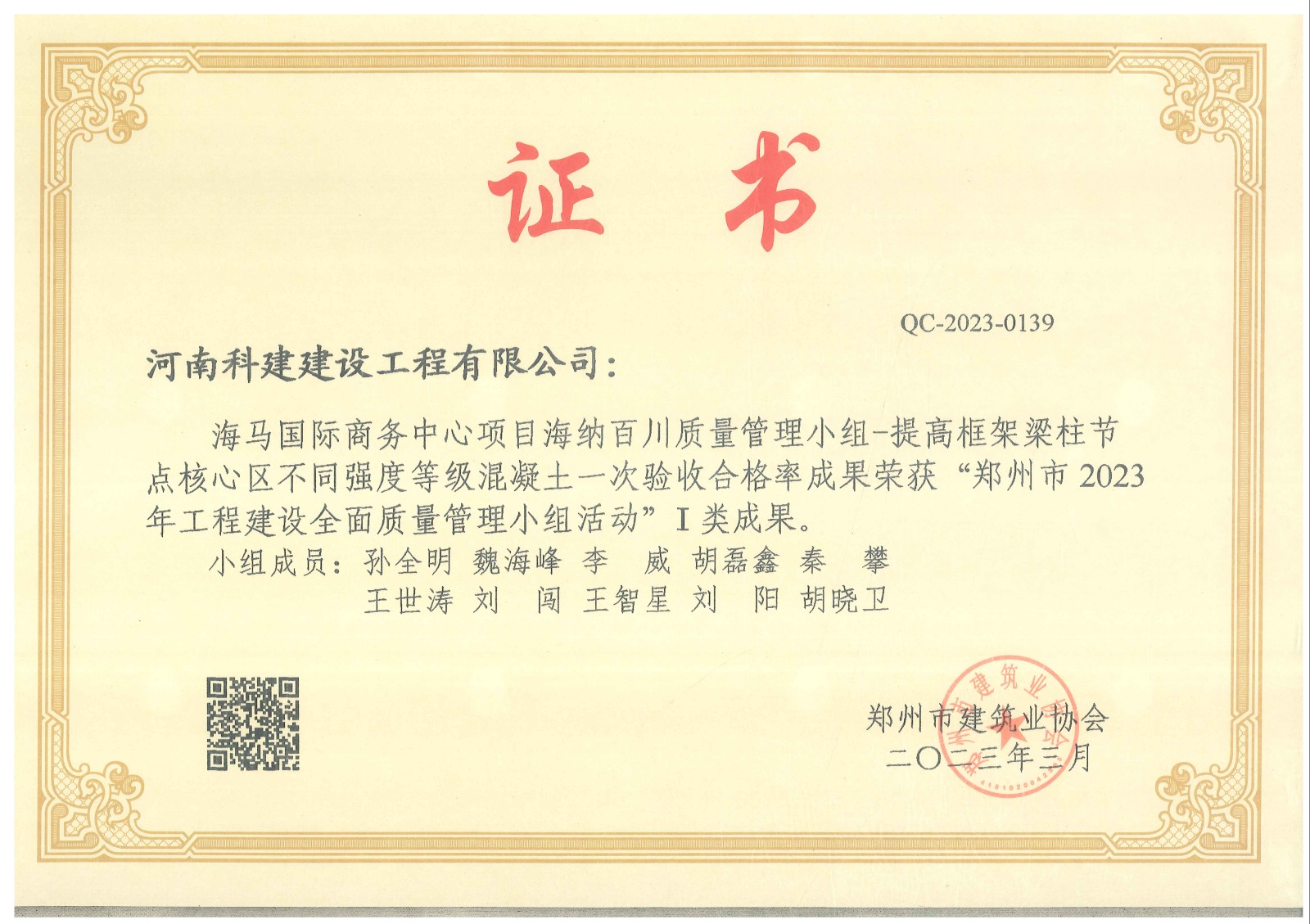 最終我公司海馬國際商務(wù)中心項(xiàng)目榮獲鄭州市2023年工程建設(shè)全面質(zhì)量管理優(yōu)秀QC成果一類成果獎(jiǎng)1項(xiàng),二類成果獎(jiǎng)2項(xiàng)。恒大趙村安置區(qū)項(xiàng)目榮獲一類成果獎(jiǎng)1項(xiàng)。經(jīng)開區(qū)人才公寓項(xiàng)目項(xiàng)目榮獲一類成果獎(jiǎng)1項(xiàng)。